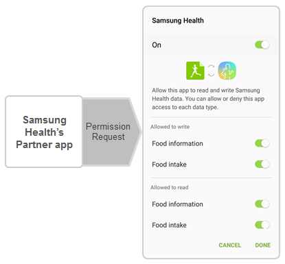 Samsung Health is an engaging app for fitness and wellbeing that runs on Android devices not only on Samsung devices. It keeps track of the users' health data and builds up the user’s health habits. Samsung Health and its partners can share the user’s data with Samsung Health SDK. The SDK provides secure health data access with applicable data types. It allows health data sharing after the user's explicit consent. The user can select detailed data sharing settings including which partner will access the user’s data, and which data will be read or written. Inserted data from the Samsung Health’s partner is shown in Samsung Health’s main screen.