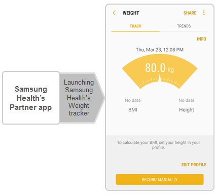 The tracker manager helps to launch a specific Samsung Health’s tracker like "Steps" or "Food". The app can select its wanted tracker that Samsung Health supports. The launched tracker can be used to check the latest health data or save a new data though Samsung Health. It is a very helpful feature to add new data conveniently in a case that an app wants to implement a data insertion feature separately. Recorded data through the Samsung Health’s tracker are saved in Samsung Health.