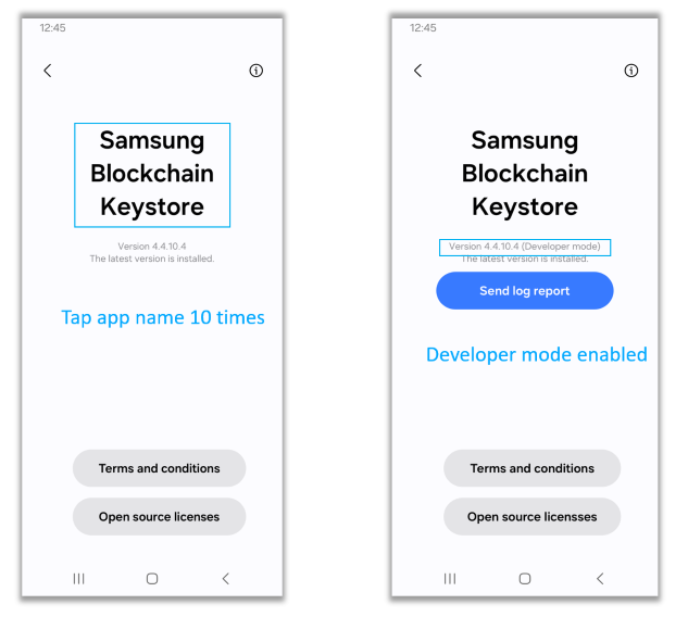 Samsung Blockchain Keystore provides a “Developer Mode” to help developers test the Samsung Blockchain Keystore. In Developer Mode, the App ID verification is bypassed, so Samsung Blockchain Keystore APIs will be enabled.