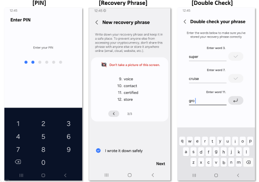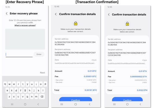 [Enter Recovery Phrase] When importing a wallet that was created from a different wallet, like a hardware wallet or Samsung Blockchain Keystore on a different device, user has to enter the 12 to 24 words. Likewise, what user enters is protected via TUI, including the keyboard.