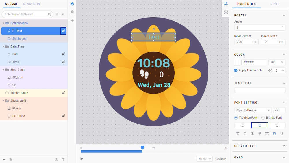 Complications are a popular component for displaying short information on watch faces and are also supported with the Premade feature. When you add a complication component to your design, you can assign its complication provider (such as watch battery, date, heart rate, etc.) to a premade design. Follow the steps below to add a complication to your watch face: