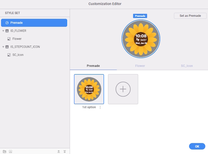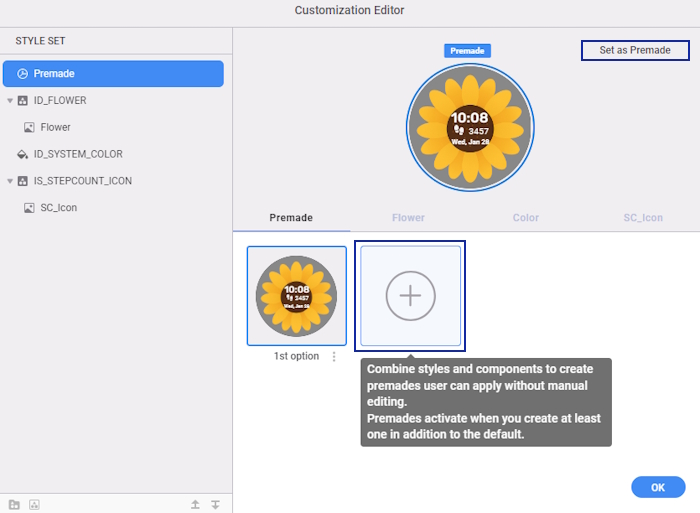 NoteThe + button and the Set as Premade button serve different purposes. The + option allows you to create a premade from the default watch face, while the Set as Premade option creates one from the currently selected styles.