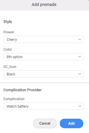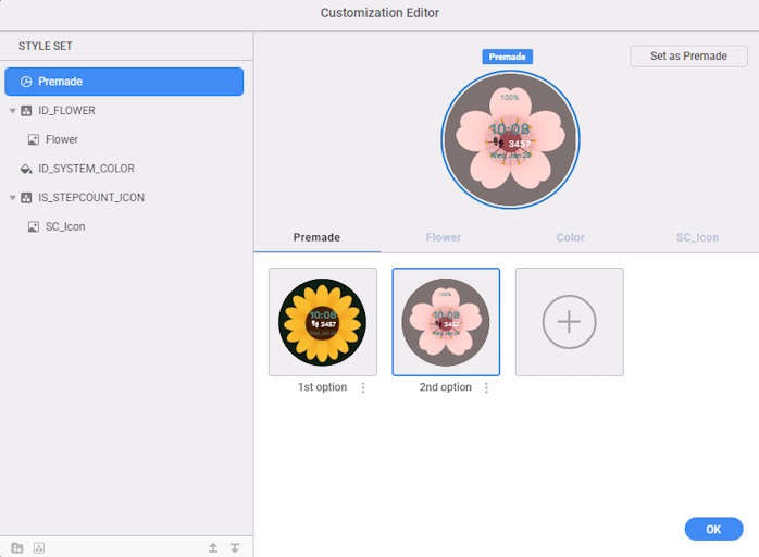 - You can further customize the premade design by choosing options in the Flower, Color, SC_Icon and Complication tabs.