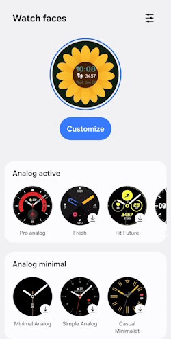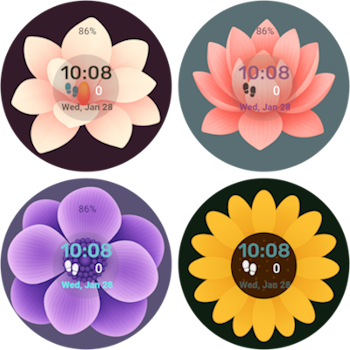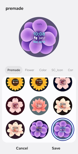 - Currently, only the default watch face design (with a sunflower as the background image, a white step count icon, no complications, and no theme color) is present in the premade collection.