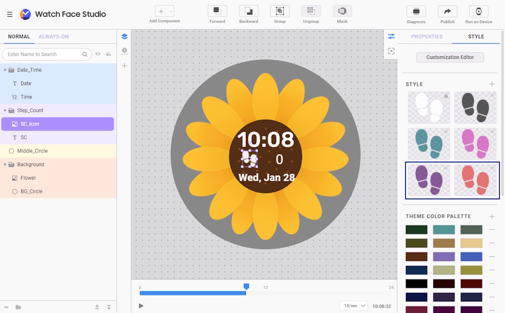 In the Style section, choose a flower option as the background, a theme color option, and the color of the step count icon.