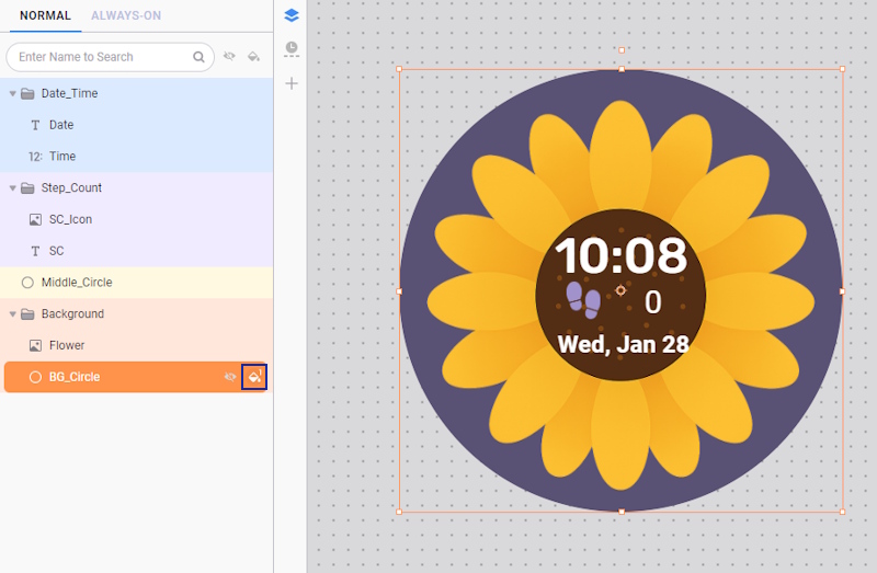 Toggle the Theme Color icon once to assign the first color of each palette to BG_Circle.