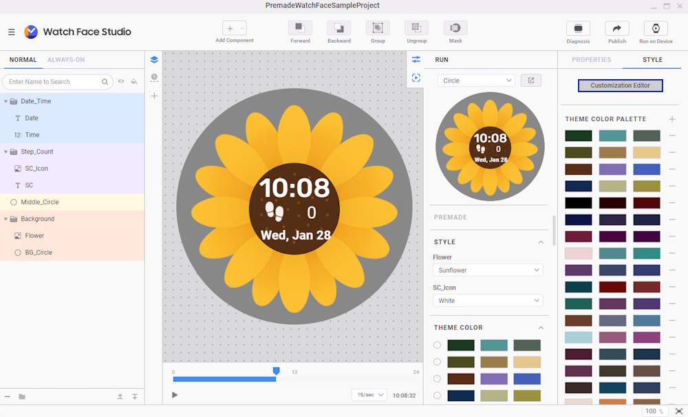 - Open the Preview Watch Face window from the Run panel to preview the premade design.