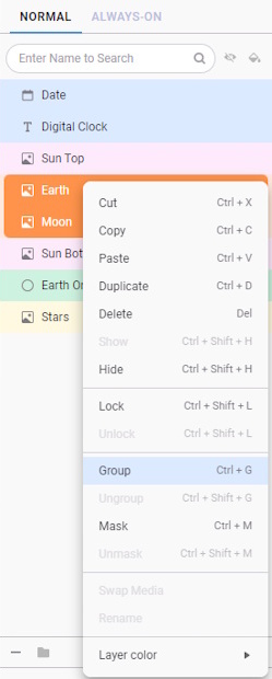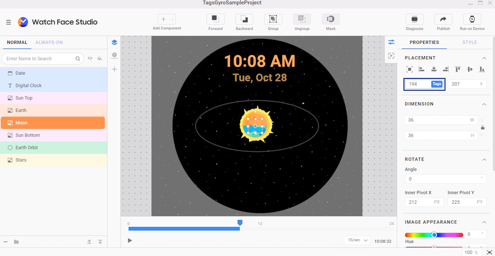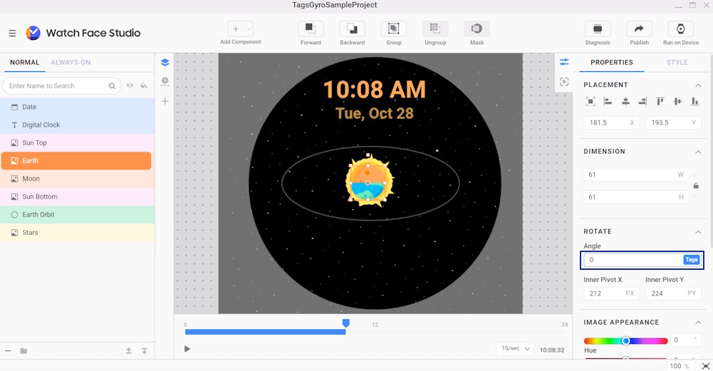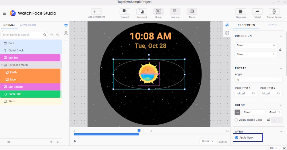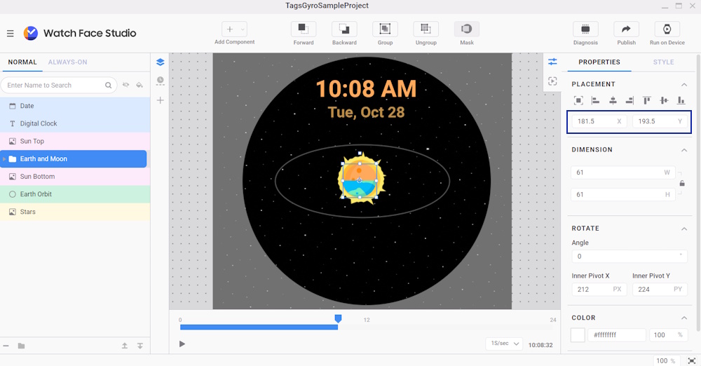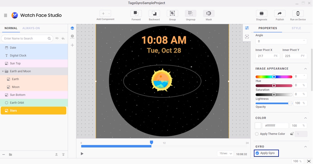 To help separate the Sun, Earth, and Moon from the background during movement, apply a larger displacement to the Stars. Since the subject and background move at different speeds, it creates a sense of depth. Increasing this difference can make the separation even more noticeable. To do this, apply gyro effects to the watch face: