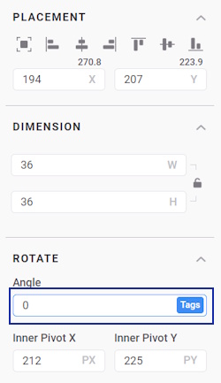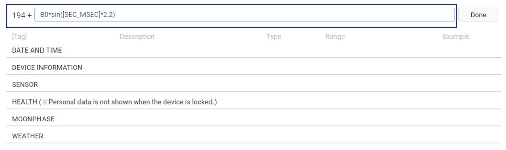 - In the Placement section, click on the Tags button on the X-coordinate. Input 80*sin([SEC_MSEC]*2.2) as its tag expression.