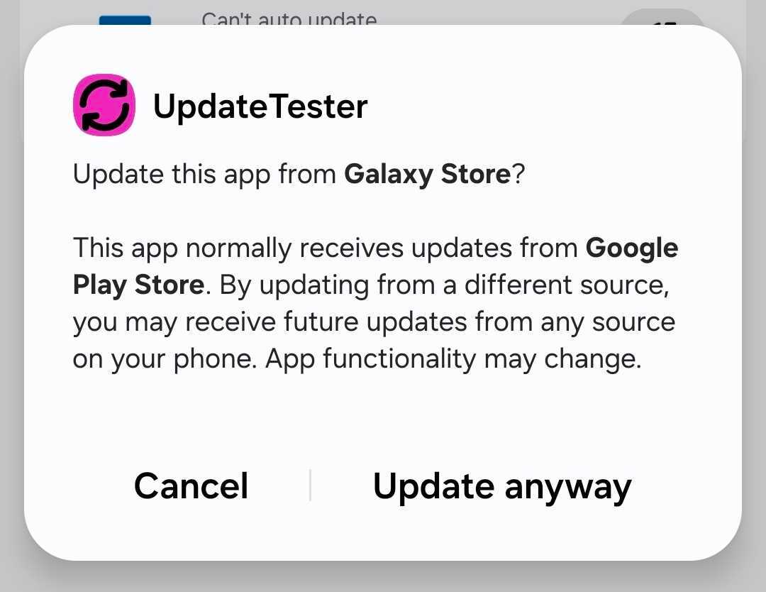 Starting with Android 14, the OS will ask users for a confirmation before updating an application that was installed by another store.