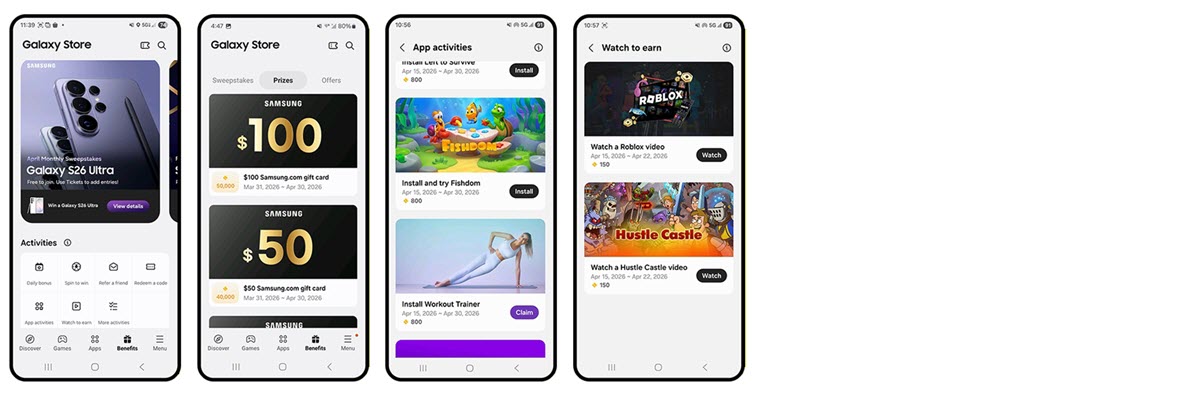 The Benefits tab is a dedicated section inside Galaxy Store where users can participate in sweepstakes for free and earn virtual Gems and Tickets by completing daily activities such as exploring featured apps and games, checking in, and watching videos. Users can redeem Gems for Galaxy Store coupons and Samsung.com digital gift cards, and use Tickets for additional entries to the weekly and monthly sweepstakes for a chance to win Samsung devices.