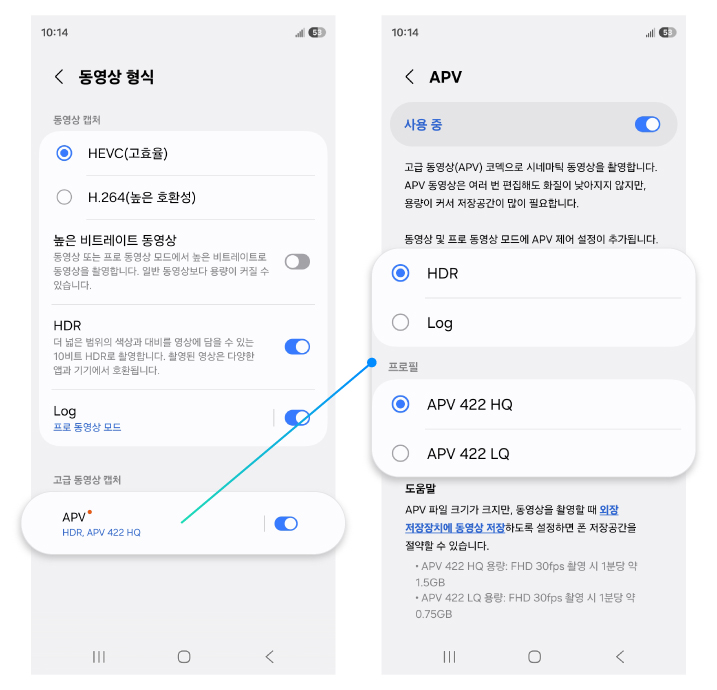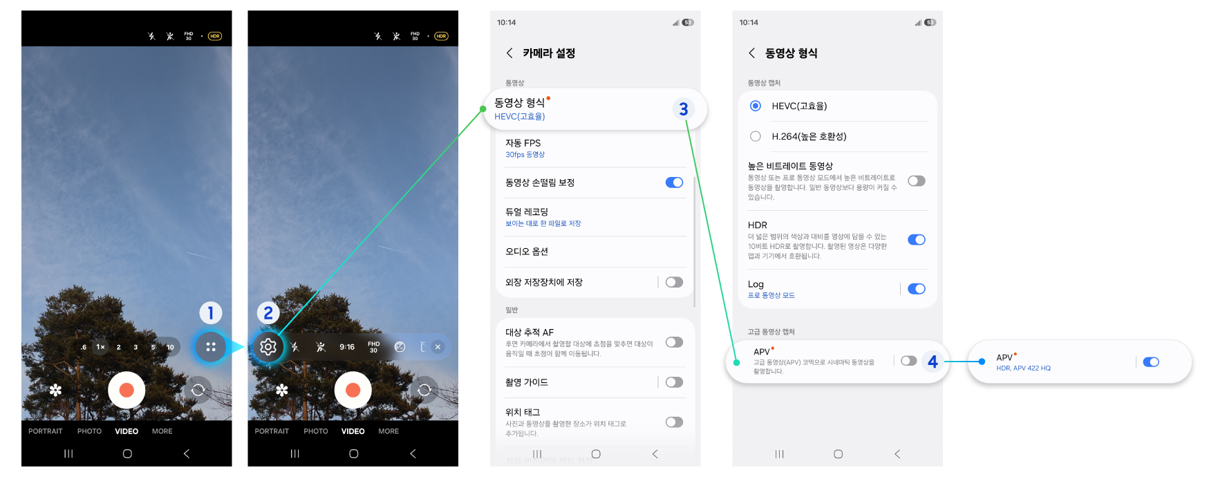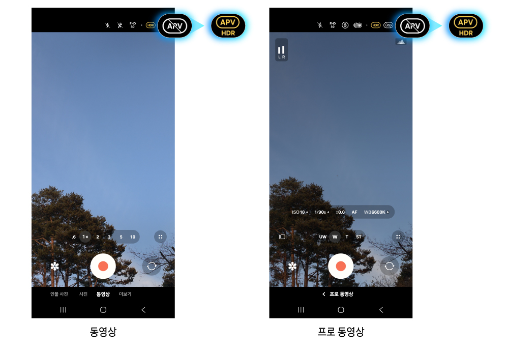 카메라 프리뷰 상단의 빠른 설정 메뉴에서 “APV”를 선택하여 촬영합니다.