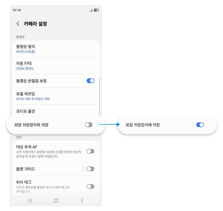 ※ “외장 저장장치에 저장” 옵션을 켜도 외장 저장장치를 연결하지 않으면, 내장 메모리에 저장됩니다.