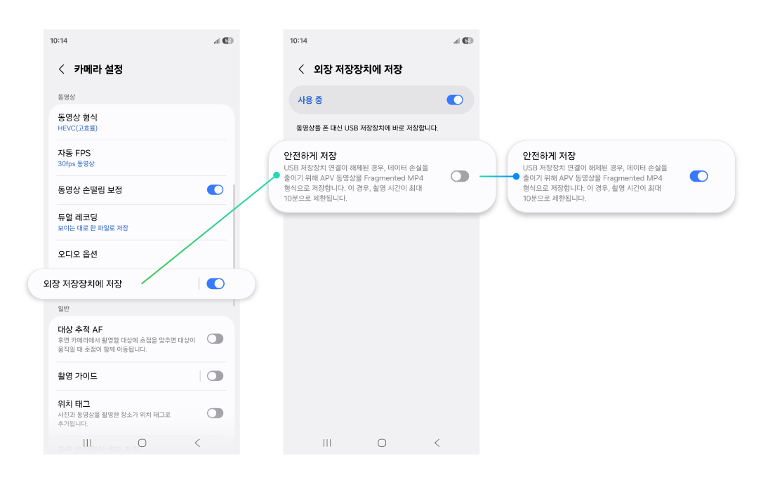 외장 저장장치를 사용할 때 촬영 중 케이블 연결이 끊어지면 촬영된 영상이 유실될 수 있습니다. 이를 방지하기 위해 “안전하게 저장” 기능을 사용하는 것이 좋습니다. 이 기능을 활성화하면 촬영 중 외장 저장장치의 연결이 끊어지는 예상치 못한 상황에서도 그 직전까지 촬영된 영상을 저장할 수 있습니다. 단, 촬영 가능 시간이 제한될 수 있으며, 저장 형식이 달라져 일부 비디오 플레이어나 편집기와의 호환성이 떨어질 수 있습니다.