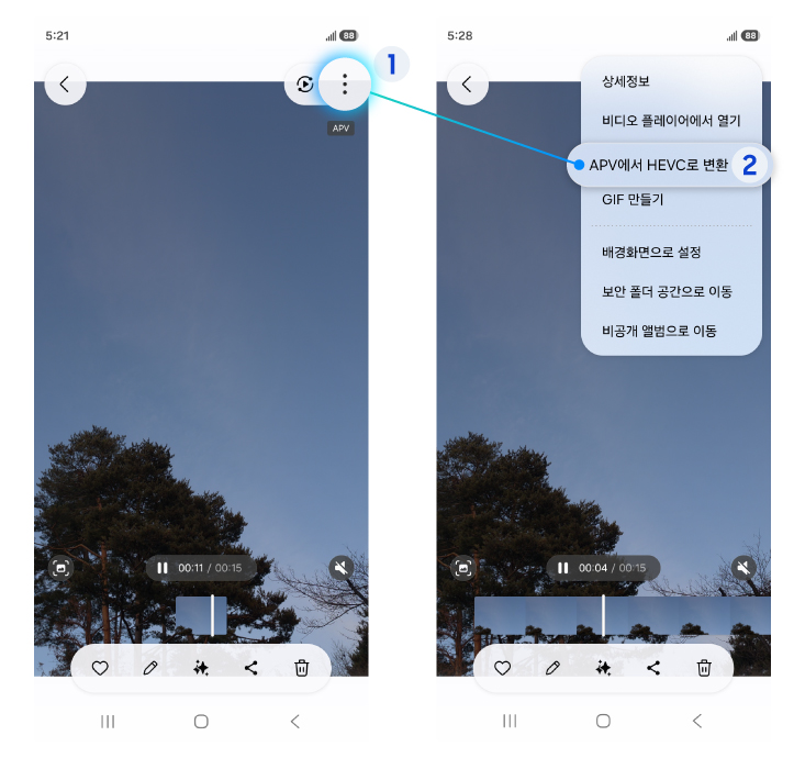 “삼성 갤러리 앱 > 메뉴 > APV에서 HEVC로 변환”