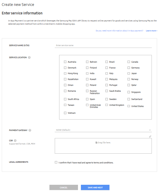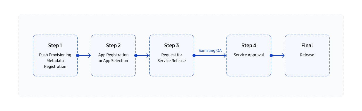 • Step 3 - Request for Service Release: Once development is complete, service release request can be submitted. The service release request requires release version of APK to be registered in the Samsung Pay Developers site.
