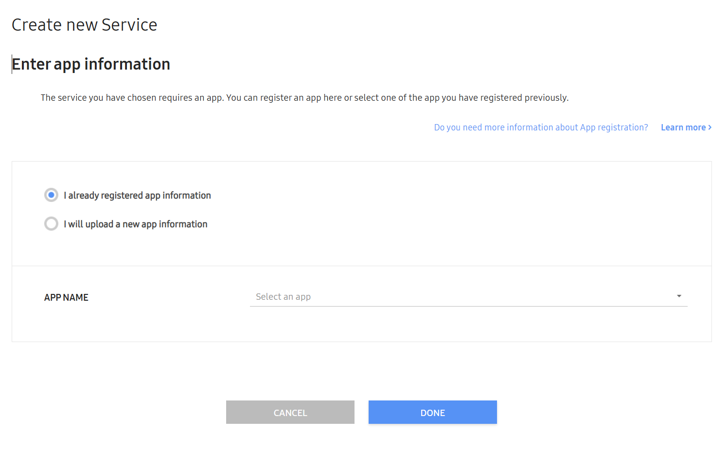 • Step 2 - App Registration or App Selection: Register an app which will be Push Provisioning card enrollment. If you wish to re-use app which you have already registered, you can select it from drop-down menu. If an app is still in development, debug key can be used for testing without having to upload APK.