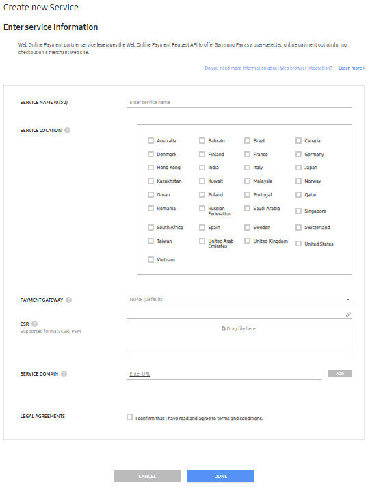 • Step 1. W3C Payment Service Metadata Registration: Create W3C Payment service by entering service specific information such as site URL.