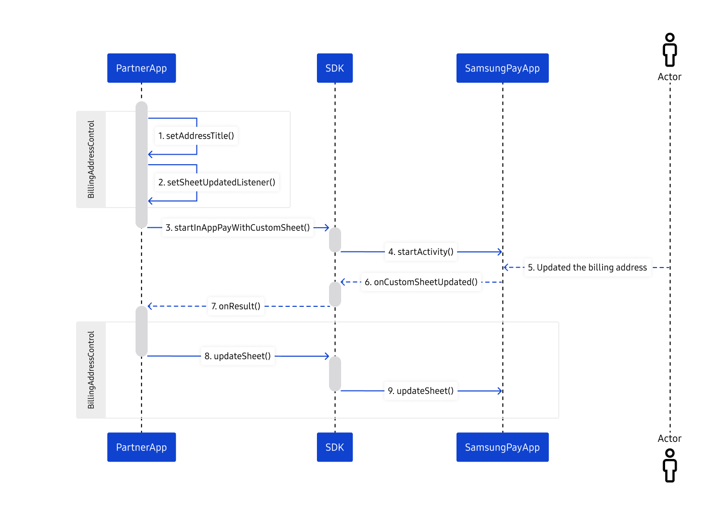 Eventually, PaymentManager. updateSheet('CustomSheet') must be called to let Samsung Pay know that no further action is pending in the merchant app.