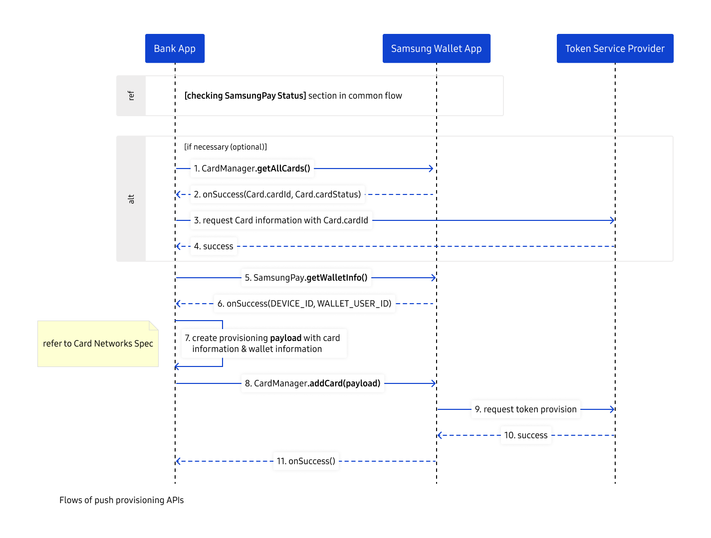 The push provisioning use case ― adding payment cards to Samsung Wallet from the card issuer’s app ― typically takes this form: