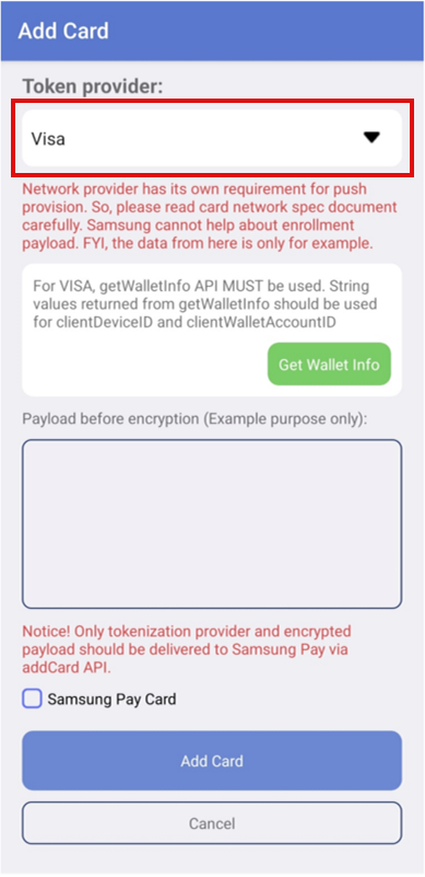 Issuer app can add card to Samsung Wallet by selecting specific token service provider (TSP) from the dropdown menu.