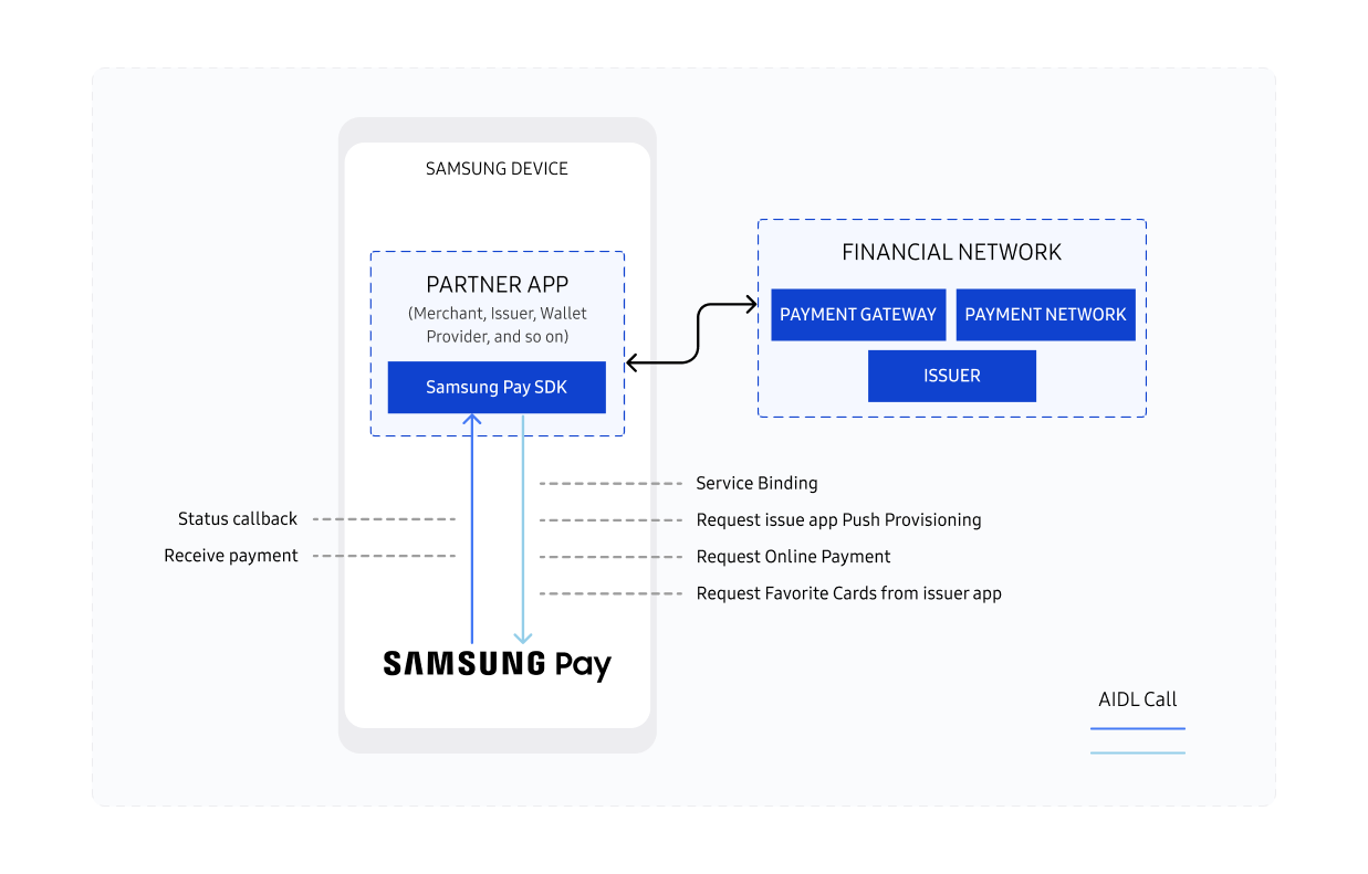 The Samsung Pay SDK allows Android-based partner apps—such as merchant apps and issuer banking apps—to securely integrate features of Integration Wallet, enabling in-app payments, push provisioning, and more.