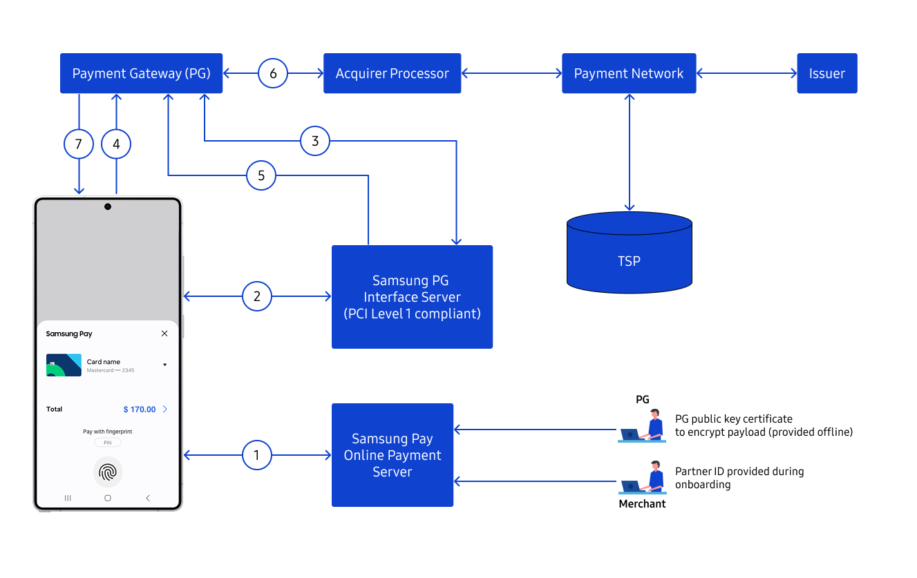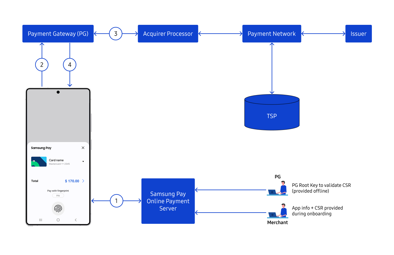 Merchant app forwards this payment information to the designated Payment Gateway (PG), either directly through the merchant's web server, or indirectly via the Samsung-PG Interface server for normal transaction processing.