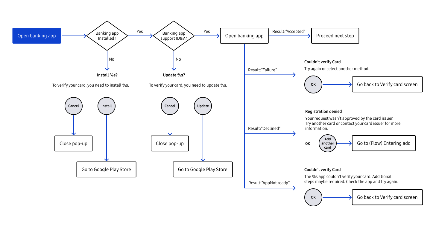 The Samsung Wallet UI flow for push provisioning using App-to-App Identity Verification (ID&V) refers to the sequence of user interface steps a user experience when adding a payment card and verifying their identity via their bank’s mobile app.