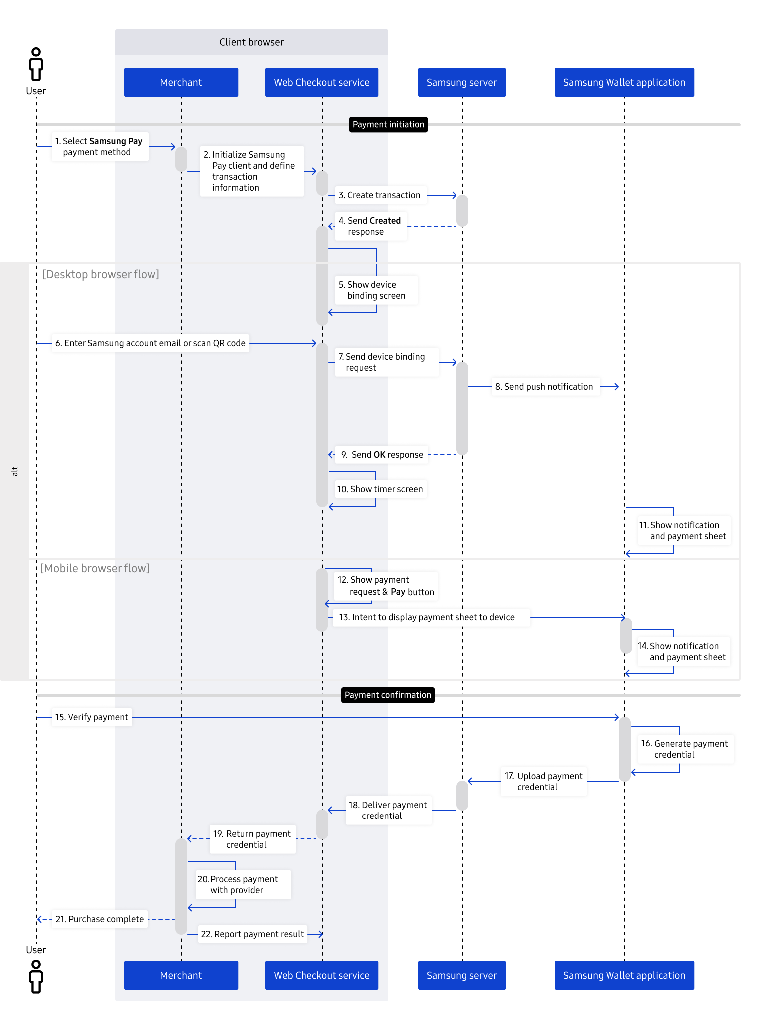 The following figures describe the user scenario for making a purchase through Samsung Pay Web Checkout.