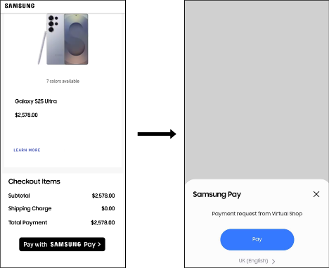 A payment request pop-up is displayed and prompts the user to select the “Pay” button. The Samsung Wallet app automatically opens on the current device.