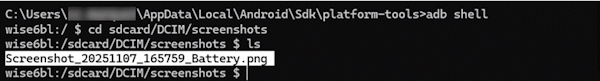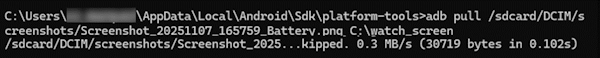 adb shell ls /sdcard/DCIM/screenshots/The ls command lists the screenshots stored on your watch.