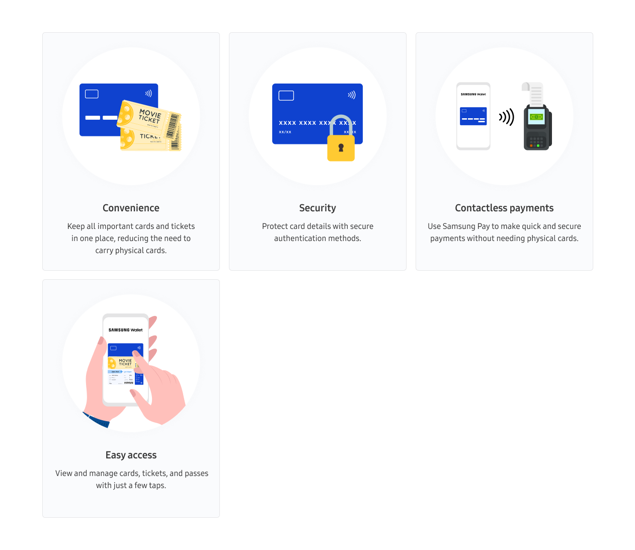 Samsung Wallet is a secure and unified digital wallet solution designed for Samsung Galaxy devices, offering users a convenient way to store and manage a wide range of digital assets—including payment cards, loyalty memberships, travel tickets, coupons, digital IDs, and more. Seamlessly integrated with Samsung’s ecosystem, it enables contactless payments via Samsung Pay, supports biometric authentication for enhanced security, and allows for real-time interactions like push notifications and location-based reminders. Samsung Wallet empowers partners and developers to deliver personalized, digital-first experiences while ensuring user data remains private and protected.